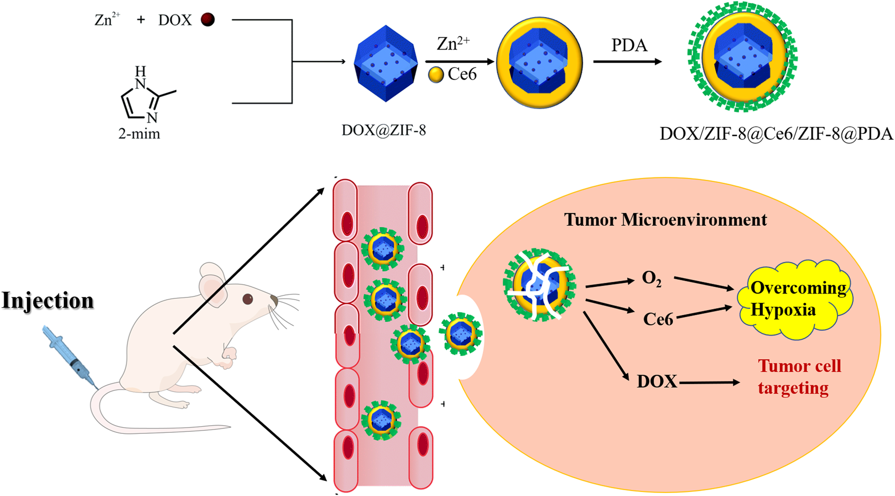 Methanol, hydrogen peroxide (H2O2, 30%), and zinc nitrate hexahydrate (≥98%) were purchased from Shanghai Aladdin Biochemical Technology Co., Ltd., Zn(NO3)2·6H2O), 2-methylimidazole (98%, C4H6N2, 2-MI), doxorubicin (C27H29NO11, DOX), Ce6, 4,6-diamino-2-phenyl indole (DAPI), and MTT assay, were purchased from Thermo Fisher Co., Ltd.; the hypoxia/oxidative stress detection kit was obtained from Enzo Life Sciences, and the annexin V-FITC/PI double staining apoptosis detection kit was purchased from Beyotime Biotechnology Co., Ltd.