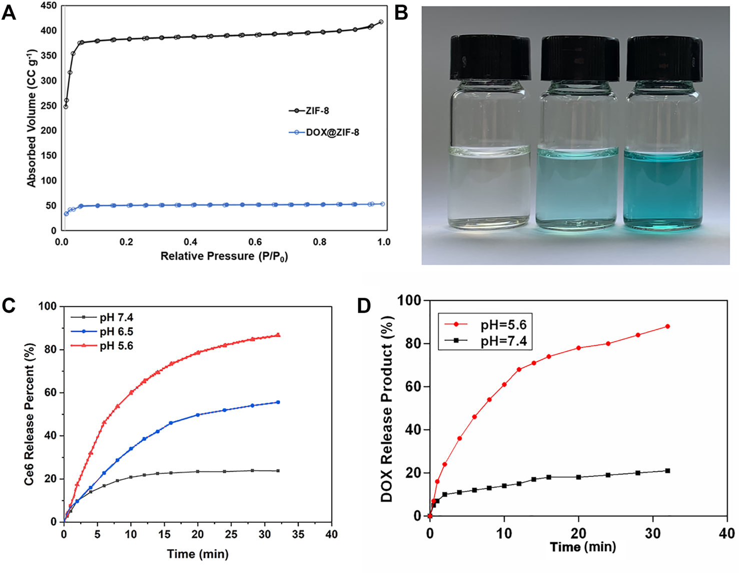 (A) N2 adsorption isotherms of ZIF-8 and DOX/ZIF-8. (B) Photos of ultrasound-treated DZCP solution. (C) Ce6-released behavior of DZCP in PBS solutions for different time points. (D) DOX-released behavior of DZCP after soaking in PBS solutions for different time points