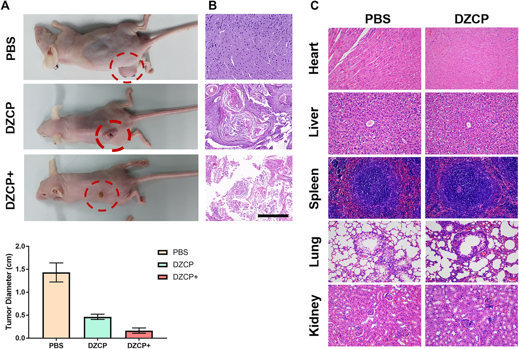 (A) Photos of 4T1 tumor-bearing mice at the end of treatments. Comparison of the PBS, DZCP, and DZCP groups. Histological images of (B) tumor sections and (C) different tissue sections after treatment. Scale bar is 50 μm.