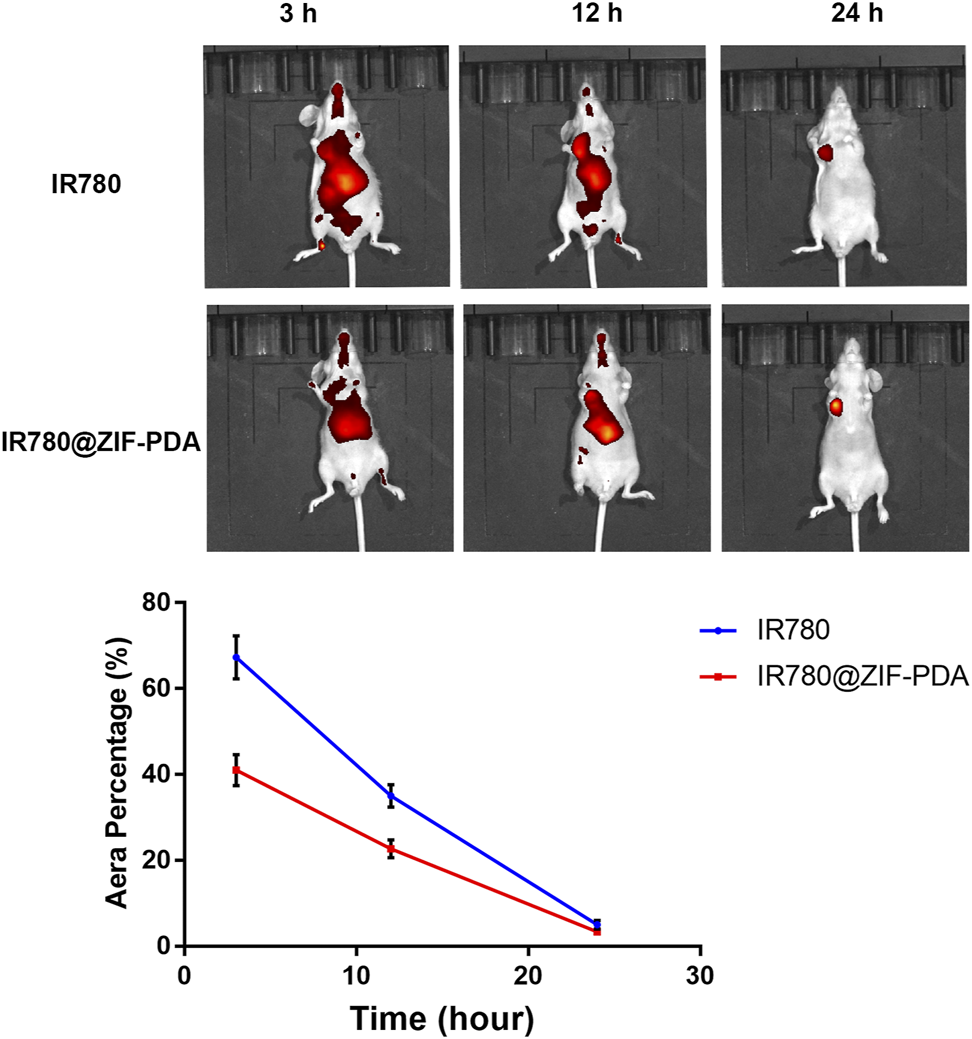 In vivo imaging mice at 3, 12, and 24 h after tail vein injection of IR780 and IR780/ZIF-PDA, respectively.
