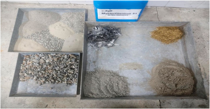 Microfibers were produced according to ASTM A820 (2004) and EN 14889-1 (2006) standards, specifically the Micro Fiber Dramix OL 6/16 (6 mm length/0.16 mm diameter), which is a bright, high-carbon wire. The macro fibers used were produced according to ASTM A820 (2004) and EN 14889-1 (2006) standards, identified as Macro Fiber Dramix 3D 45/35 (45 mm thickness/35 mm length), which consists of bright wire glued with water-soluble adhesive. For mineral additives, F-type fly ash compliant with ASTM C 618 (2019) was obtained from the Isken Thermal Power Plant. Figure 1 shows the materials used in the preparation of hybrid steel fiber-reinforced concrete mixtures with fly ash.