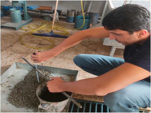 The slump test was conducted in accordance with the TS EN 12350-2 (2010) standard to determine the consistency of the fresh concrete mixtures. In the developed concrete designs, a superplasticizer admixture was utilized to maintain the slump values of the concrete consistently within the range of 14 ± 2 cm. Furthermore, the unit weights of the fresh concrete were also determined. The slump test conducted during this study is illustrated in Figure 2.