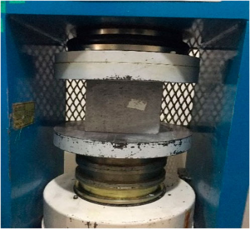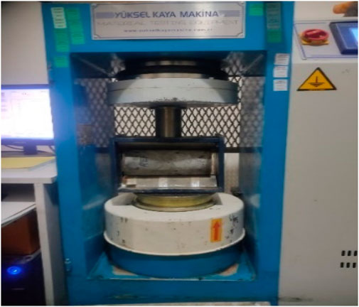 Following the completion of the designated curing periods for the 150 × 150 × 150 mm specimens, compressive strength values were determined in accordance with the TS EN 12390-3 (2019) standard, utilizing a uniaxial concrete compression press as illustrated in Figure 3. For the compressive strength test, specimens were cured for 7, 28, and 90 days under controlled conditions of 20°C ± 2°C and ≥95% relative humidity.