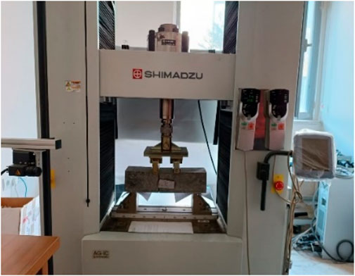 For the flexural strength test, specimens were cured for 7, 28 and 90 days under controlled conditions of 20°C ± 2°C and ≥95% relative humidity. Specimens with dimensions of 100 × 100 × 400 mm were subjected to a flexural tensile strength test under two-point loading, adhering to the TS EN 12390-5 (2019) standard. The test was conducted using a Shimadzu testing machine, as depicted in Figure 4. A loading rate of 165 N/s was employed during the test. Flexural tensile strength was calculated using Equation 1, presented below, based on the maximum load recorded on the load indicator: