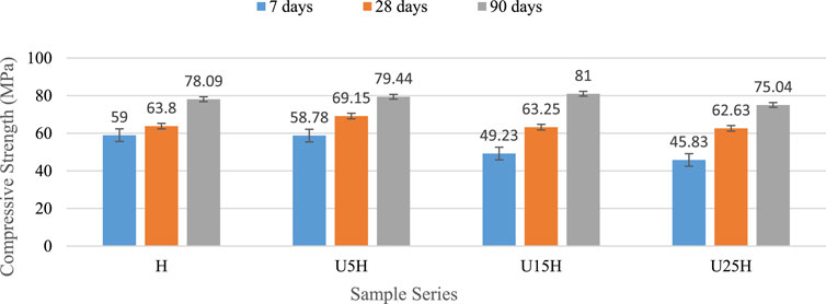 Examining the U15H series, which exhibited the maximum strength at 90 days, reveals an increase in compressive strength of approximately 65.53% compared to its 7-day strength.