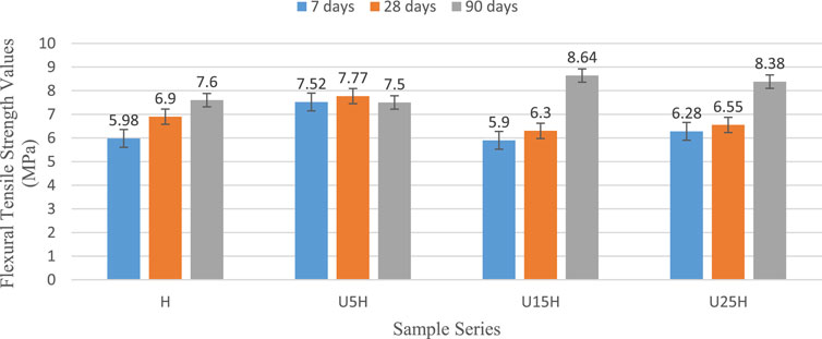At 90 days, a decrease of 1.32% is observed for the U5H series. In contrast, increases in flexural tensile strength are observed for the U15H and U25H series, approximately 13.68% and 10.26%, respectively.