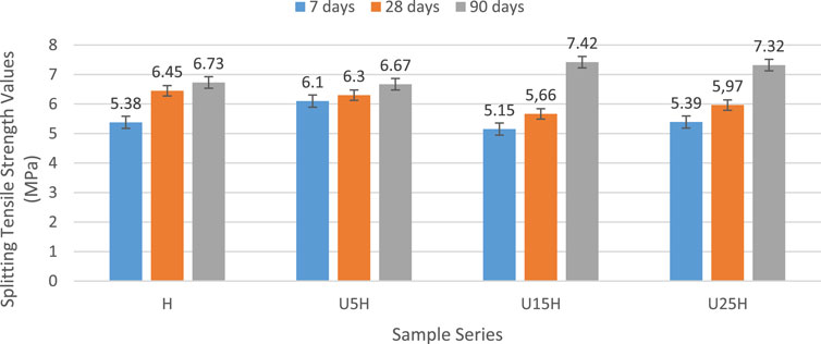 At 90 days, the minimum strength value of 6.67 MPa was obtained from the U5H series, while the maximum strength value of 7.42 MPa was obtained from the U15H series.