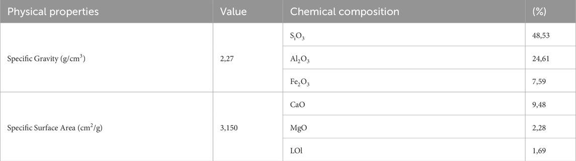 Among mineral admixtures, fly ash is one of the most suitable and economical mineral additives for cement and concrete (Ünal and Şimşek, 2022). Fly ash, a byproduct of coal combustion, is a cost-effective and sustainable material that improves concrete’s workability, flow ability, and late-age strength (Khan et al., 2014; Mark et al., 2019).