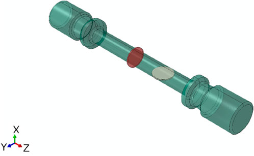Figure 1. Uniaxial creep test piece (green) in relation to the small punch test piece given in two orientations (red and grey). The LPBF build direction is the Z-axis.