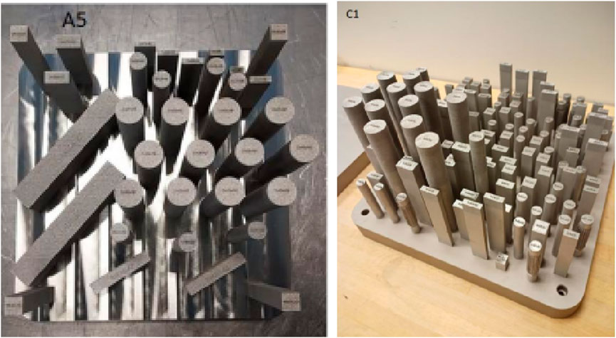 The powder feedstock was then used to manufacture bars on a build platform (Figure 2). In this article, we use bars manufactured using a Renishaw AM250 single laser machine at the Advanced Manufacturing Centre (AMRC), University of Sheffield, and Commissariat à l'énergie atomique et aux énergies alternatives (CEA), using an SLM Solutions SLM280HL single laser, both using argon as an inert gas. The bars used in this work are in the as-built z-direction, protruding out of the build platform, as shown in Figure 2.