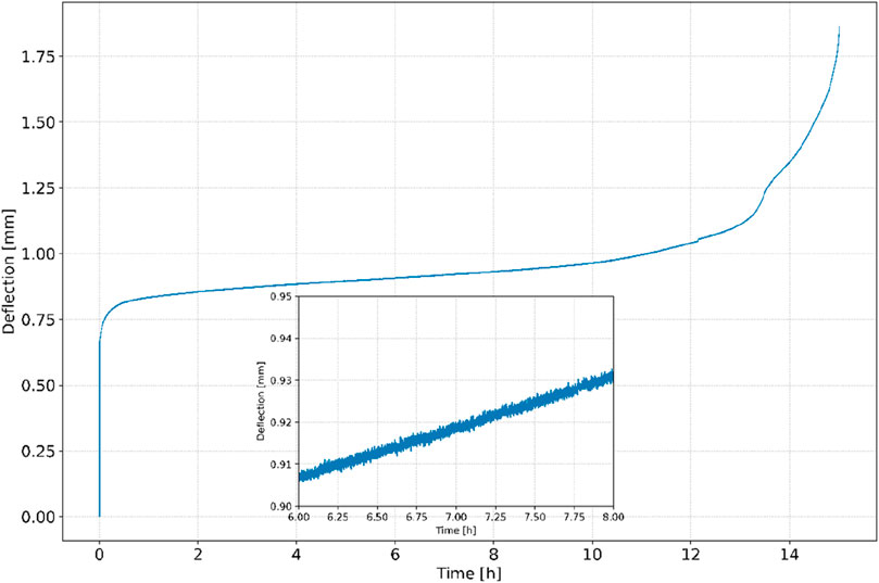 Accurate deflection measurements and estimation of deflection rate are essential for calculating equivalent stress, Equation 1, and creep assessment in general. Temperature control precision, susceptibility of the laboratory environment to external vibrations, and systematic noise are only a few of the influencing parameters. A typical recorded deflection during an SPC test in our laboratory is given in Figure 4. A sampling rate of 1 Hz is used to capture the initial load application. Because our data acquisition software can only sample at a constant rate, a 1 Hz sampling rate is maintained for the duration of the test.