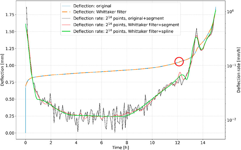 We tackle the issue by first down sampling the deflection signal to 214 = 16,384 points using a linear interpolation. This significantly reduces the number of points for processing the signal, decreasing computational time for noise filtering and calculation of deflection rate. A large number of points can result in a prohibitively large amount of required memory. A larger number of points can be used for longer experiments. In the second step, we deal with the noise. One way is to split the signal into segments and calculate the linear regression line for each segment. We investigated the impact of 50, 100, 200, and 300 segments. Using 200 segments was determined to be the optimal number in terms of minimizing noise while still retaining sufficient local detail (important for, e.g., determining the crack initiation). The deflection rate is then the inclination of the regression line. This decreases noise in the calculated deflection rate, but significant local peaks remain; see the black solid line in Figure 5. If a Whittaker noise filter (Eilers, 2003) is applied prior to calculating the regression lines, the noise in the calculated deflection rate improves further. However, there are still a number of local variations; see the red solid line in Figure 5. We also tried several methods for calculating a derivative, available in the Python “derivative” library. The best performing method was using a “spline” derivative; see the solid green line in Figure 5. The combination of a Whittaker noise filter and the spline derivative method consistently resulted in very good noise removal, preservation of significant local variations in the deflection curve (see the red circle), and few artificial peaks in the calculated deflection rate. This combination is therefore used in all further results in this article.