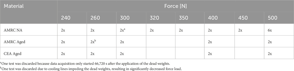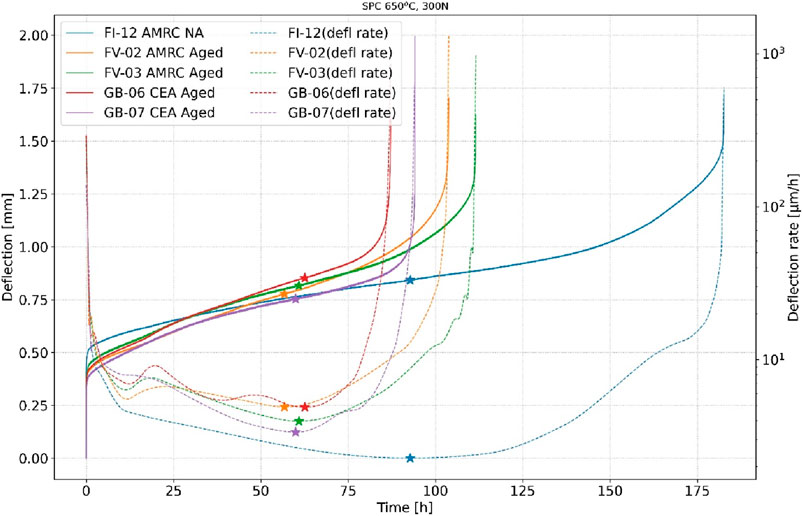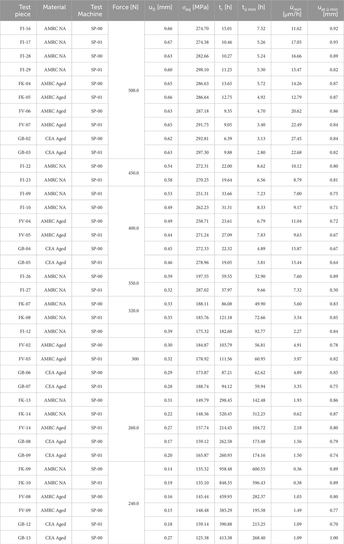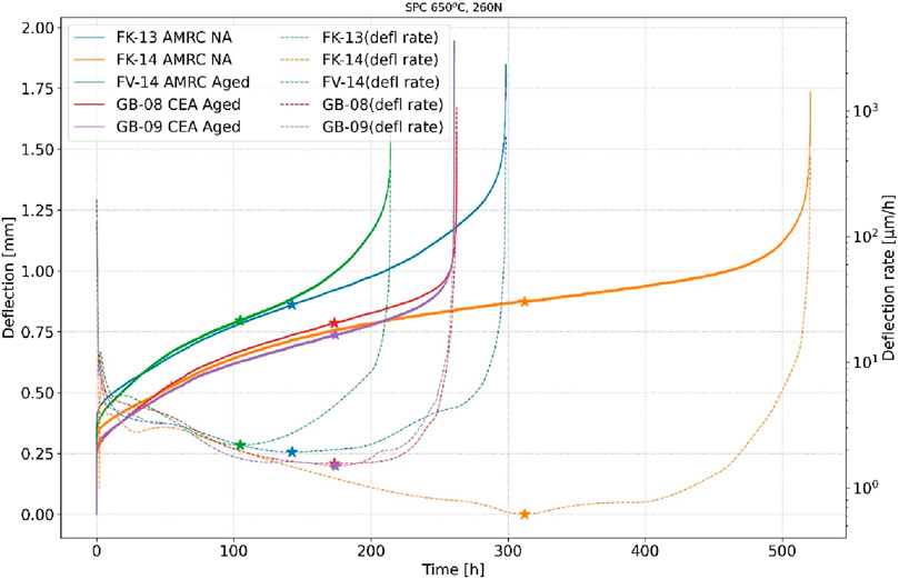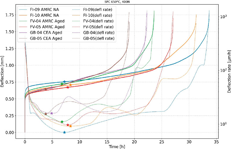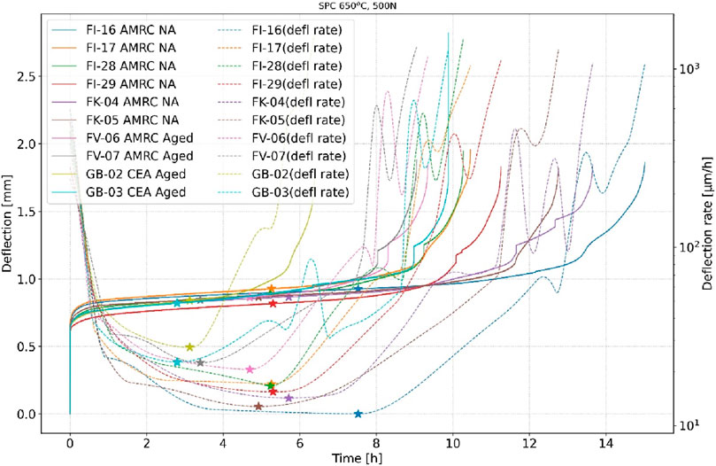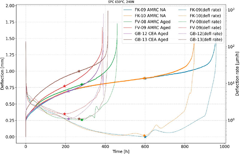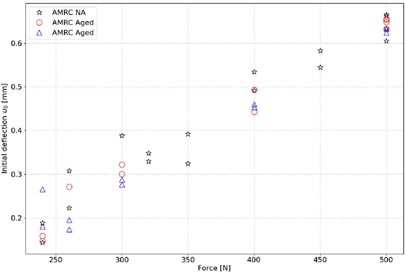 Figures 7–14 show measured deflections during SPC tests at load rates from 500 N to 240 N (Jorge and Myriam, 2025). The symbols indicate the time at which the minimum deflection rate was estimated, using the procedure described above. In general, the aged material exhibits shorter creep life. In addition, the minimum deflection rate occurs earlier for the aged material; see Table 5. The exception is the AMRC NA FK-13 test at 260 N, where the minimum deflection rate occurs earlier than in both CEA Aged tests (GB-08, GB-09). In general, the CEA Aged creep lives are somewhat shorter than AMRC Aged lives at loads from 500 N to 300 N. At 260 N and 240 N loads, there is no significant difference between the two.