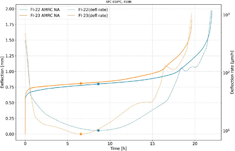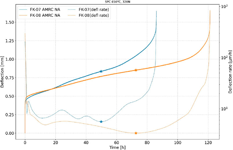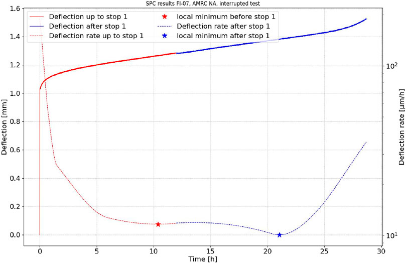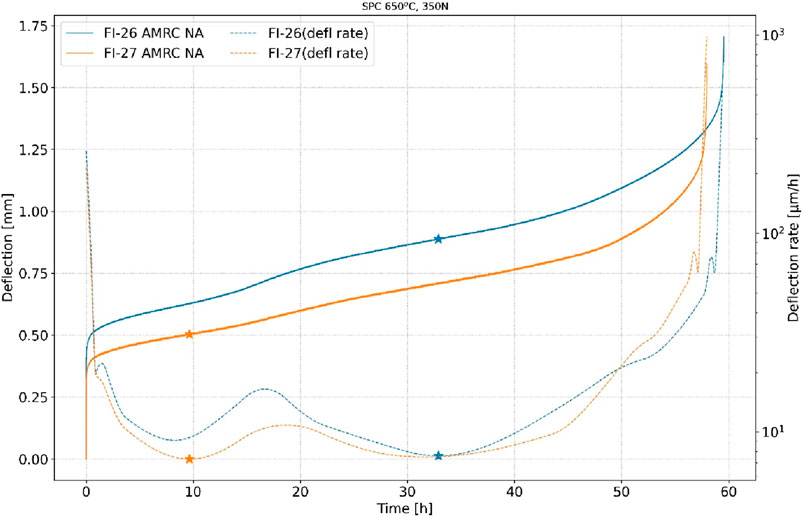 Next, we put the FI-07 test piece back into the test machine, added the same dead weights to reapply a 326 N force load, and heated the test piece back to 650 °C. After reaching the target temperature, we waited for 16 h and 48 min (cumulative time 12 h + 16 h + 48 min) and then initiated the second interruption, using the same procedure as for the first interruption. A second SEM analysis was performed (see the lower part of Figure 16). The analysis showed the arrest of the first crack front and full development of the second, much larger crack front that only started forming after the first interruption. We did not continue the SPC tests beyond this point, 16 h and 48 min (cumulative time 12 h + 16 h + 48 min). The deflection versus time curve and the calculated deflection rates indeed show two minima (Figure 17), although these minima are less pronounced than the ones at 350 N (Figure 10). Nevertheless, this confirms our conjecture that cracks formed during the SPC test. More interrupted tests are required to confirm that crack initiation results in a local minimum in the deflection rate.