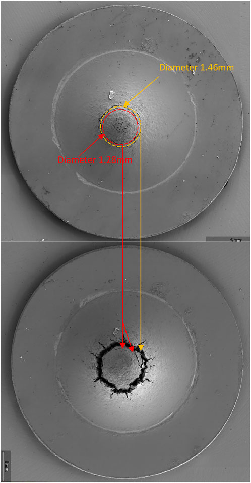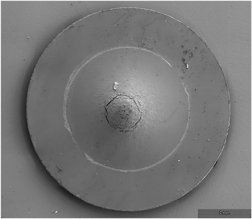 Based on the SPC tests at 350 N, we decided to interrupt the SPC test for the first time 12 h after application of the force load of 326 N. We defined the interruption as stopping the furnace heating by setting the target furnace temperature to 22 °C, triggering the cool down. During the cool-down, the force load remained at 326 N. Following the cool-down, we removed the dead weights, removed the test piece from the test machine, and performed a scanning electron microscope (SEM) analysis of the test piece. Two crack fronts are visible, as shown in Figures 15, 16. The first crack front with a diameter of 1.28 mm is fully developed after 12 h. The second front, with a diameter of 1.46 mm, has only started developing.