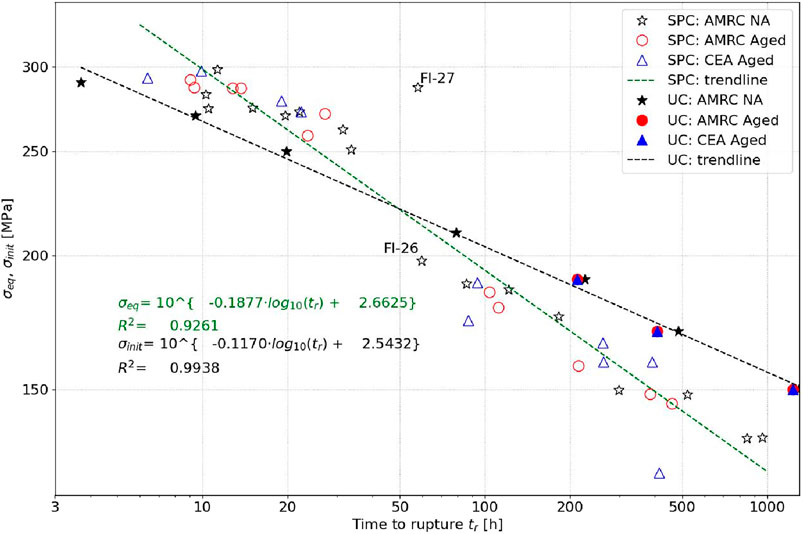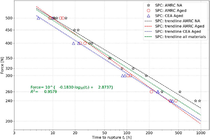 Figure 18 shows the time to rupture versus the applied force for the SPC test data for the three materials and the regression lines. This confirms again that the aged materials have consistently reduced creep life compared to the non-aged material.
