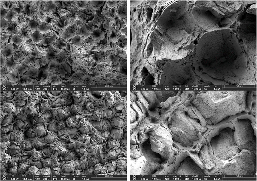 Several explanations are possible for the SPC trendline having a different slope than the UC trendline. First, Equation 1 is based on one minimum in the SPC deflection rate, whereas here, we can have two minima, as shown in Figure 10. In this work, we always select the one with the lowest deflection rate value to use in Equation 1. However, as shown in Figures 15–17, the first minimum is probably the one where the initial crack has already formed. If the second minimum is used, the measured deflection is not solely due to creep but is significantly affected by the crack propagation. Second, the orientation of the SPC test pieces in relation to the uniaxial test piece is the one shown in red in Figure 1. This was driven by the limited amount of material, as more disc slices for SPC test pieces can be extracted from a bar in the red orientation than in the gray SPC orientation. In the SPC test, most of the stress acts in the radial direction of the SPC test piece. With the red SPC test piece orientation, the red SPC test piece has stress perpendicular to the stress in the uniaxial test piece. We are therefore testing a different material direction in the SPC tests. In fact, we should have used the gray SPC test piece orientation, but as mentioned, this was not possible due to the limited amount of available material. The SPC test piece orientation in relation to the test build can have a significant impact on the time to rupture in LPBF. For Inconel 718, Zhang et al. (2025) report significantly shorter rupture times for the SPC test piece in the build direction (red color in Figure 1) compared to the one perpendicular to the build direction (gray color in Figure 1). In this case, only aged heat treatment was applied. However, when they applied the solution and aged heat treatments, the differences in rupture times decreased significantly. This behavior is at least in part driven by a different microstructure (Zhang et al., 2025) of the two directions. Third, and probably the most important, Equation 1 has been developed based on 97 UC tests and 159 SPC tests with both new and service-exposed materials, mainly low-alloy steels and 9Cr steels, such as 14MoV63, X20CrMoV121, P91, P92, Eurofer97, and stainless steel 316L (CEN EN, 2024). However, this data set had a large share of P92 steel. Equation 1 coefficients 1.916 and 0.6579 are probably not the best for AM 316L material.