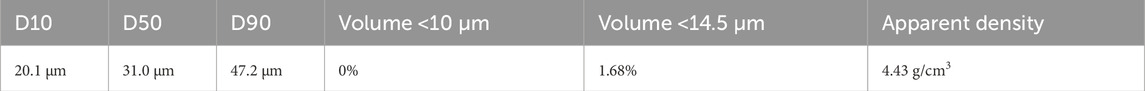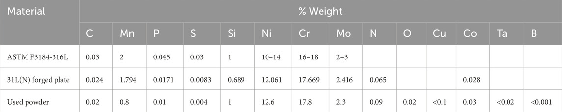 A 316L stainless steel feedstock powder was used to manufacture bars for material tests using the laser powder bed fusion (LPBF) additive manufacturing process in accordance with the ASTM F3184 (ASTM F3184-16 Standard Specification for Additive Manufacturing Stainless Steel Alloy, 2024). The basis for the feedstock powder chemical composition requirements was taken from ASTM F3184, with additional requirements imposed for the weight % of N, O, Cu, Co, Ta, B, and Cu. The chemical composition of the feedstock powder is comparable to the 316L(N) forged plate but lower in the C (0.02 vs. 0.024) and Mn (0.8 vs 1.794) content and higher in Si (1 vs. 0.689). Table 1 provides the chemical composition, while the measured particle size distribution is given in Table 2.
