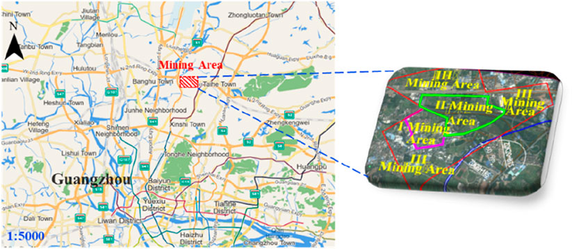 The Longgui Nitrate-Salt Mine is located in Yongtaizhuang and Gaoqiaozhuang, Taihe Town, Baiyun District, Guangzhou, approximately 18 km south of Yuexiu Park, as shown in Figure 2. The Liuxi River flows northeast to southwest into the Pearl River to the west of the mining area. The Guangcong Highway and Guanghua Highway are situated on the east and west sides of the mining area, 2.1 km and 1.5 km from its center, respectively, with multiple village roads connecting them. The Guangzhou North Second Ring Expressway and Beitai Highway cross the central part of the mining area. The salt-bearing strata generally extend northeastward, with a length of 5.95 km, a width of 2.25 km, and an area of approximately 9 km2. The total thickness of the mineralized intervals ranges from 50 to 150 m, with the salt layer roof consisting of salt-dissolution mud conglomerate aquifer areas at varying stratigraphic levels. The mining area is divided into three mining areas I, II, and III. The mine employs solution mining to extract rock salt and associated glauberite deposits at elevations between 470 m and 575 m below ground surface. The salt deposits cover an area of about 2.35 km2. After 20 years of mining, underground cavities with a total volume of 9.09 million cubic meters (9.09 × 106 m3) have formed in the mining area (Zhang et al., 2025).
