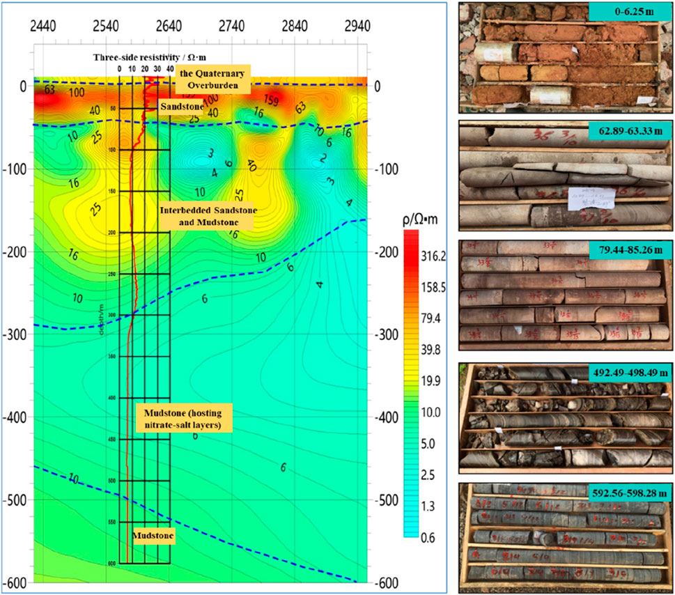 The survey lines were divided into five stratigraphic layers based on resistivity curves from three-directional resistivity logging. Layer 1, above elevation 0 m with resistivity of 30–80 Ω m, corresponds to. Layer 2, between elevations −50 m and 0 m with resistivity of 20–300 Ω m, exhibits near-horizontal bedding and is interpreted as sandstone based on geophysical features and borehole data. Layer 3, spanning elevations −300 m to −50 m with resistivity of several Ω·m to 60 Ω m, reflects interbedded sandstone and mudstone. Layer 4, at elevations −600 m to −160 m with a resistivity of less than 10 Ω m, primarily comprises mudstone hosting nitrate-salt layers near elevation −500 m. Solution mining-induced hydraulic fracturing in this layer creates cavities, which collapse and fill with water-softened mudstone. Residual brine infiltrates upward through fractured mudstone, reducing resistivity above the cavities. If the overlying mudstone remains intact, brine-filled cavities form extensive low-resistivity areas. Layer 5, below elevation −460 m with a resistivity greater than 10 Ω m, consists of mudstone influenced by mining activities, with resistivity increasing with depth. Drilling revealed concealed limestone beneath the mudstone. This layered interpretation framework guided CSAMT data analysis (Figure 4).