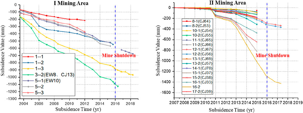 Figure 9. Time-dependent subsidence curves of monitoring points from subsidence inversion (2003–2019).