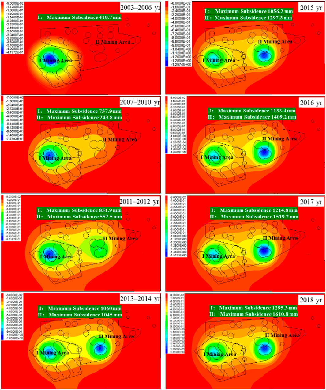 The time-dependent subsidence curves of numerical simulation monitoring points in Mining Areas I are shown in Figure 9, while the vertical displacement nephograms of the ground surface are presented in Figure 10. After mining cessation, subsidence rates in Mining Area I remained largely unchanged. In Mining Area II, however, significant reductions in subsidence rates were observed near monitoring points 15-1, 15-2, and 16-2 within the subsidence center. From 2016 to 2017, the subsidence rate at monitoring point 1six to two in Mining Area II decreased to 117 mm/y. Although still rapid, this represents a notable decline compared to the pre-cessation rate of 329.9 mm/y. Numerical inversion results further indicate a post-cessation subsidence rate of 113 mm/y at monitoring point 1six to two in Mining Area II, closely aligning with field monitoring data. Comparative analysis of inversion results across well groups demonstrates consistency in subsidence center locations, maximum subsidence magnitudes, and site-specific subsidence trends, validating the rationality of the inversion process.
