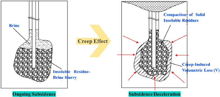 By comparing field subsidence monitoring data with numerical inversion results, post-sealing ground subsidence is primarily attributed to creep-induced contraction of cavity clusters. When the creep contraction volume equals the effective cavity volume (i.e., pure brine-filled space), the solid insoluble residues within the salt cavities begin to compact and gradually provide structural support—a process termed drainage consolidation of insoluble residues. From this stage onward, subsidence rates associated with the cavities further decelerate. A schematic of cavity contraction and residue compaction is illustrated in Figure 11.
