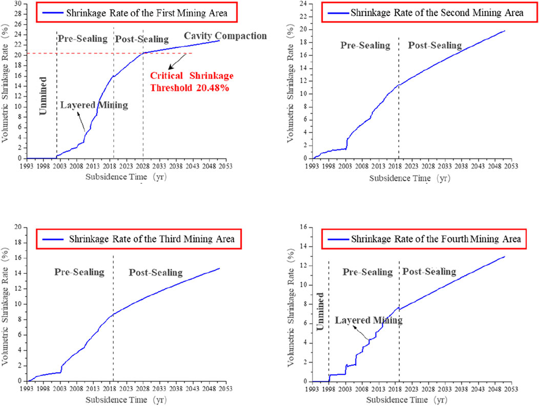 The temporal evolution of average volumetric shrinkage rates for each mining area is shown in Figure 13. Taking the end of 2018 as the completion milestone for well sealing, all four mining areas exhibit reduced shrinkage rates post-sealing. Significant volumetric contraction primarily occurred during active mining. The layered extraction method in Mining Area II caused stepwise increases in shrinkage rates for the first and fourth mining areas. By the end of 2050, the shrinkage rates for the four mining areas are projected to reach 22.83%, 19.84%, 14.64%, and 12.99%, respectively. The first and second mining areas display higher shrinkage rates, while the third and fourth remain lower. For the first mining area, cavity shrinkage volume equalled its residual volume (20.48%) by 2028. Beyond this critical compaction threshold, insoluble residues begin to structurally support cavities, sharply reducing the creep rate. The average shrinkage rate of the first mining area drops from 0.505%/y (2019–2027) to 0.108%/y (2028–2050). Other mining areas maintain stable shrinkage rates until 2050: 0.262%/y (second), 0.187%/y (third), and 0.174%/y (fourth). This equilibrium persists until the second mining area reaches its critical compaction threshold of 29.8%.