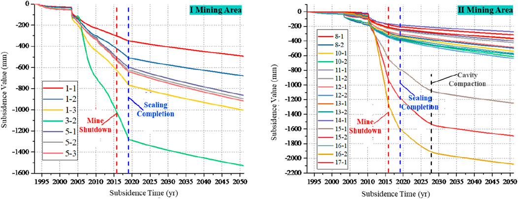 Mining operations ceased entirely in 2016. Post-mining subsidence monitoring data (Figure 8) show that while subsidence rates in Mining Area I decreased slightly, the reduction was marginal. In contrast, Mining Area II experienced a pronounced slowdown in subsidence rates, attributed primarily to the discontinuation of submersible pumps, which likely stabilized cavity pressures.