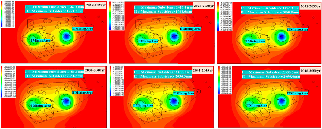 Vertical ground displacement nephograms for 2019–2050 are presented in Figure 15. From 2019 to 2025, maximum subsidence in Mining Areas I and II reaches 1,367.6 mm and 1,879.5 mm, respectively, representing increases of 72.3 mm and 268.7 mm over 2018 levels, with annual rates of 12.05 mm/y and 44.78 mm/y. Although subsidence rates near Well Groups 15, 16, and 17 (subsidence center of Mining Area II) decline post-sealing, they remain the highest in the mining area until 2028. By 2050, the maximum subsidence is projected to reach 1,553 mm in Mining Area I and 2,096 mm in Mining Area II, with subsidence centers remaining unchanged.
