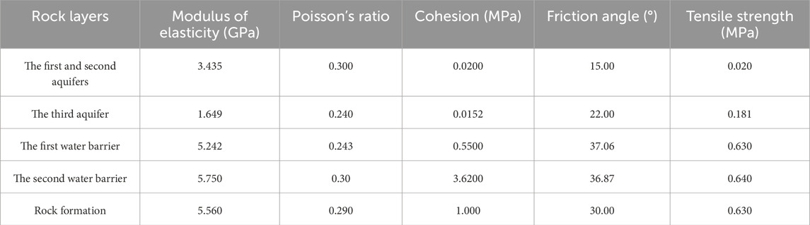 Table 2 presents the elastoplastic calculation parameters in the subsidence calculation inversion process. The classical Mohr-Coulomb strength theory is adopted in this elastoplastic calculation. This model is a kind of shear stress strength theory, which comprehensively reflects the strength characteristics of rocks. It is applicable to the shear failure of both plastic rocks and brittle salt rocks, and also reflects the characteristic that the tensile strength of rocks is much less than the compressive strength. Thus, it is widely used in geotechnical engineering practice.