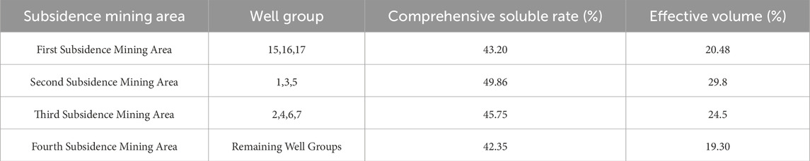 The contraction of cavities is characterized by monitoring their volumetric shrinkage rates. Well Groups 1–22 are classified into four subsidence mining areas based on subsidence severity. Well Groups 15, 16, and 17 near the subsidence center of Mining Area II are designated as the first subsidence mining area, exhibiting significantly greater and more uniform subsidence compared to other well groups in Mining Area II. Similarly, Well Groups 1, 3, and five near the subsidence center of Mining Area I form the second subsidence mining area, with subsidence magnitudes far exceeding those of Well Groups 2, 4, 6, and 7 in Mining Area I. The collapse and deformation of cavities in these two mining areas result in dual subsidence centers. Due to relatively uniform subsidence in other well groups, the remaining well groups in Mining Area I and II are categorized as the third and fourth subsidence mining areas, respectively. The comprehensive soluble rate for each mining area is calculated as the average of its constituent well groups (Table 3).