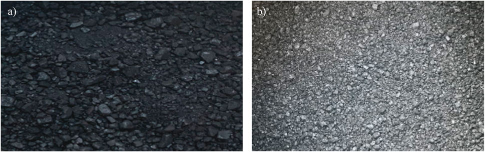 The study employs SK-90 asphalt (Shell Tianjin) combined with limestone aggregates and mineral powder from Beijing sources. DCLR from Shenhua Coal-to-Liquid Chemical Co. (Figure 1a). and ICLR from Lu’an Group (Figure 1b) - both exhibiting black particulate morphology - underwent dust removal, crushing, and screening processes. Comparative particle size analysis with limestone fine aggregates revealed distinct gradation characteristics (Figure 2), with fundamental material properties documented in previous group studies (Wang et al., 2022a; Ji et al., 2020). These coal liquefaction residue, initially solid at ambient temperature, are processed to achieve size compatibility with limestone aggregates and employed in controlled substitution experiments. (Wang et al., 2022b; Ji et al., 2020).