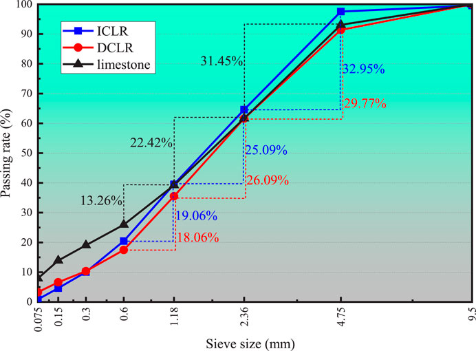 Sieve analysis (Figure 2) reveals comparable particle size distributions among ICLR, DCLR, and limestone fine aggregates, with 0.6–4.75 mm fractions constituting 77.10%, 73.91%, and 67.13%, respectively. While limestone contains elevated sub-0.075 mm particles (12.6% vs. <5% for residues) due to inherent clay content, the remaining fractions show marginal variation. This gradation similarity (Kolmogorov-Smirnov p > 0.05) confirms ICLR/DCLR’s potential as limestone substitutes, particularly in the critical 0.6–4.75 mm range governing aggregate interlock.