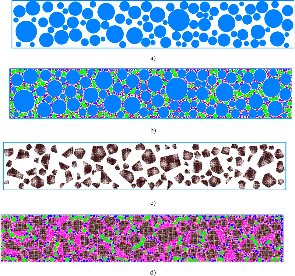 Figure 4. Schematic diagram of the reconstruction process of the rut plate specimen. (a) Generate coarse aggregates. (b) Generate fine aggregates. (c) Using clump random cutting to generate irregular coarse particles. (d) Randomly delete small asphalt particles to ensure a design porosity of 4%.
