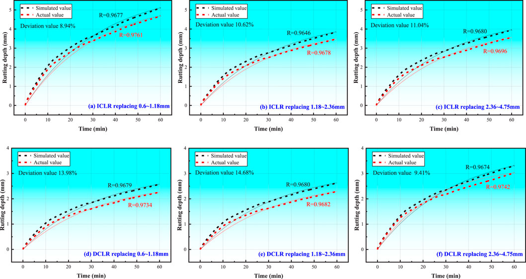 Figure 5. Comparison between simulated and actual rutting depth: (a) ICLR replacing 0.6∼1.18 mm. (b) ICLR replacing 1.18∼2.36 mm. (c) ICLR replacing 2.36∼4.75 mm. (d) DCLR replacing 0.6∼1.18 mm. (e) DCLR replacing 1.18∼2.36 mm. (f) DCLR replacing 2.36∼4.75 mm.