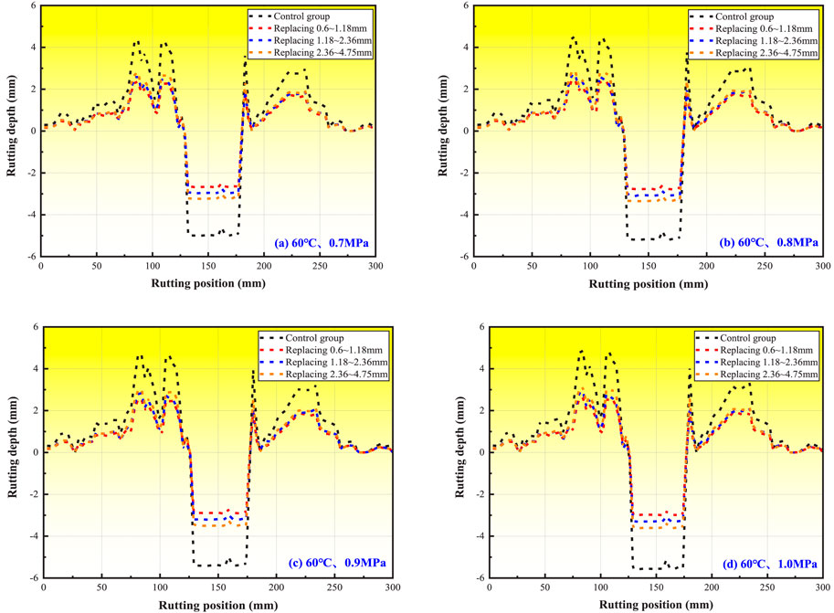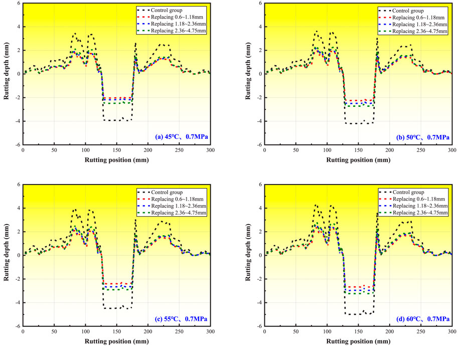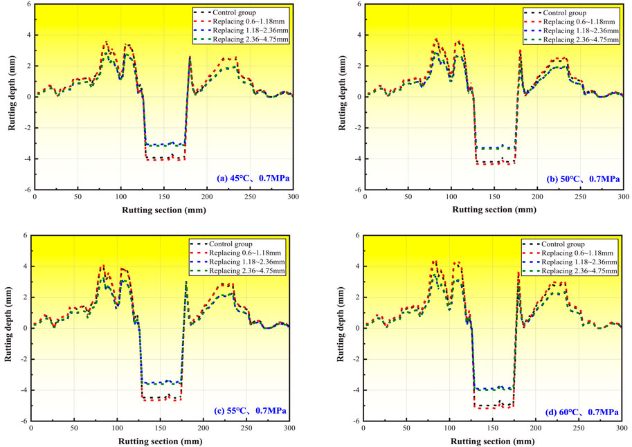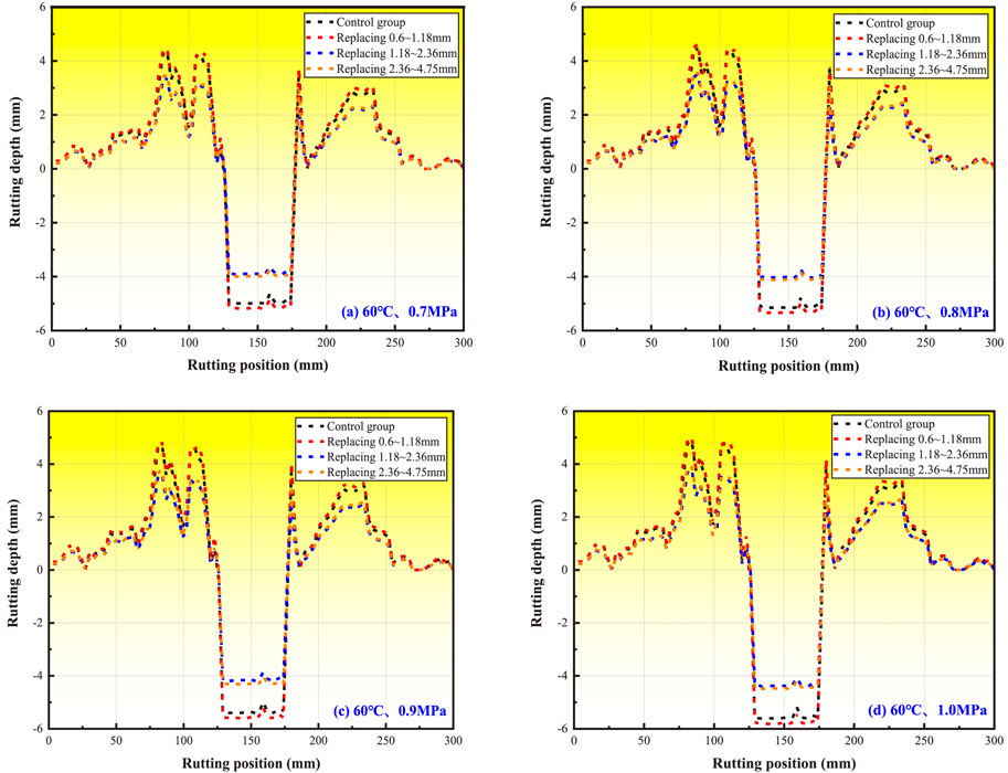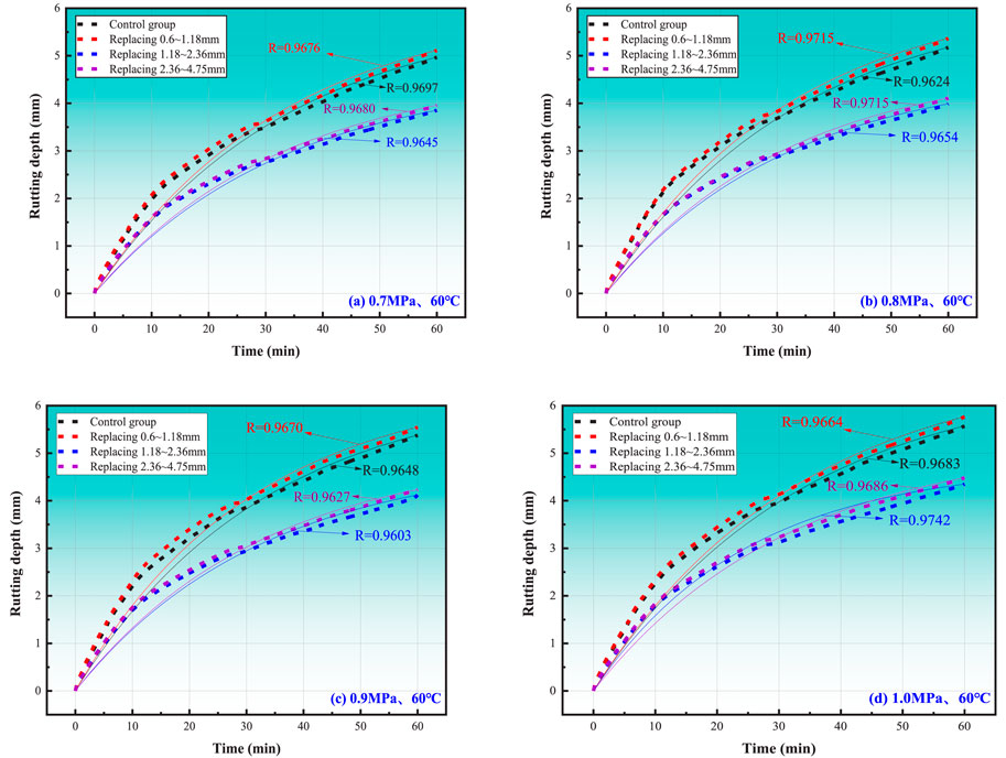 1. Figure 10 demonstrates consistent rutting development trends across four loading conditions, mirroring temperature-dependent behavior. Under standard load (0.7 MPa), temperature increases from 45 °C to 60 °C caused rut depth increments of 26.38% (control), 24.78% (0.6–1.18 mm), 27.15% (1.18–2.36 mm), and 33.62% (2.36–4.75 mm). Conversely, at 60 °C, load increases from 0.7MPa to 1.0 MPa resulted in smaller growth rates: 12.12%–13.27%. These results indicate that temperature exerts a greater influence on rutting deformation than mechanical loading.