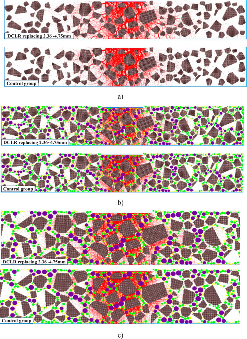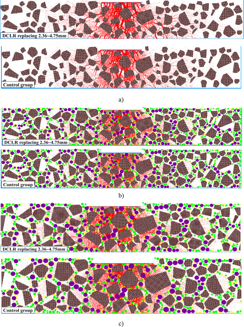 1. Figure 14 demonstrates that particle deformation under load produces distinct force chain patterns: quasi-linear strong chains (high force transmission, dense distribution) versus sparse weak chains (low force transmission) (Peng, 2016; Mingfeng et al., 2018). The DCLR-modified mixture (2.36–4.75 mm replacement) exhibits sparser force chains in the wheel path compared to the denser control group distribution. This difference arises because DCLR enhances high-temperature resistance, reducing particle displacement and collision forces, while the conventional mixture’s greater particle movement generates more intensive force chain networks under identical loading conditions.