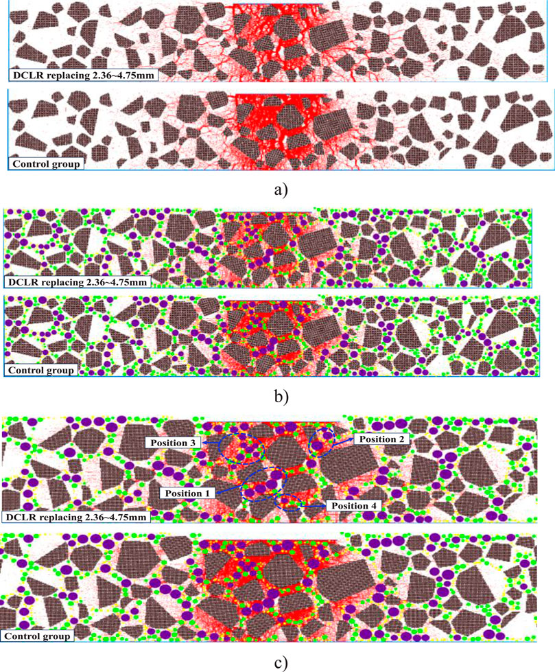 2. While coarse aggregates form the primary skeleton in asphalt mixtures, force transfer between them occurs through fine aggregates. Mid-loading observations reveal dense red spots around aggregates, demonstrating how 2.36–4.75 mm DCLR particles (positions 1–2) effectively bridge coarse aggregates, exhibiting both macroscopic skeletal functions and microscopic force transmission capabilities. In contrast, smaller DCLR particles (0.6–2.36mm, positions 3–4) primarily serve as fillers with minimal contact force distribution. These findings highlight the dual structural role of 2.36–4.75 mm DCLR particles in maintaining both macro-scale framework stability and micro-scale force transmission.