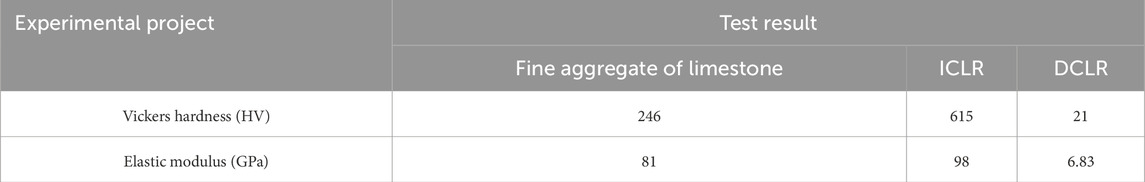 Vickers hardness and elastic modulus tests were conducted on ICLR, DCLR, and limestone fine aggregates using the MH-500 micro-Vickers hardness tester from China and the Hysitron TI 950 nanoindentation tester from the United States. The results are shown in Table 1.