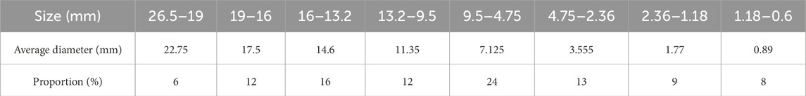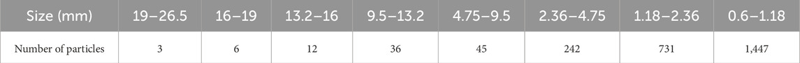 Particle Flow Code (PFC) simulations face computational inefficiency from excessive sub-0.6 mm particles, which increase entity counts and processing time. To optimize computational economics, sub-0.6 mm fractions were redistributed through mass-proportion adjustments across coarser gradations, employing average diameters per gradation level for particle quantity estimation. The optimized size distribution parameters are detailed in Table 4.