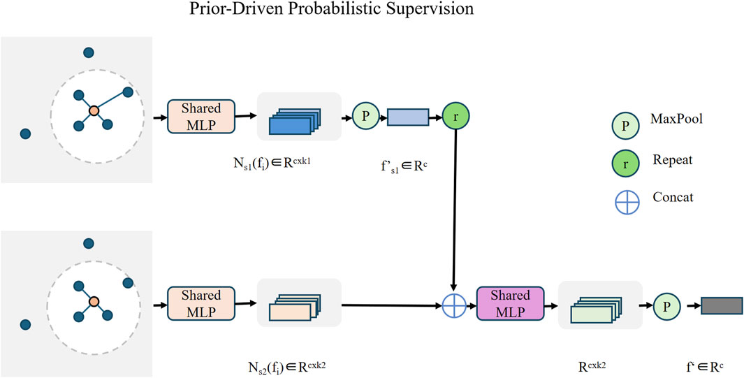 Figure 4. Schematic of the Prior-Driven Probabilistic Supervision module in the Guided Progressive Distillation (GPD) framework. The method leverages neighborhood feature aggregation through shared MLPs and hierarchical pooling to generate smoothed, context-aware representations. Empirical co-occurrence priors are used to modulate label distributions, mitigating annotation noise and class imbalance while enabling uncertainty-aware learning for robust defect classification.