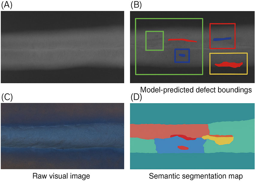 Figure 5. Representative examples of weld defect detection across different imaging modalities. (A) Raw X-ray image of a dissimilar metal weld; (B) Detection results with color-coded bounding boxes corresponding to different defect types: pores (green), cracks (red), inclusions (blue), and lack of fusion (yellow); (C) Raw visual image of the same weld seam; (D) Semantic segmentation map highlighting the same defects in color-coded regions. This demonstrates the model’s ability to identify multiple defect types under varying imaging conditions.