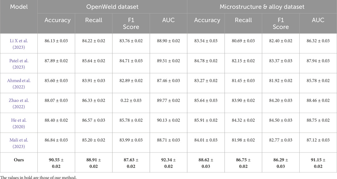 Table 1. Performance benchmarking of our method against state-of-the-art on OpenWeld and microstructure & alloy datasets.