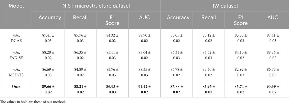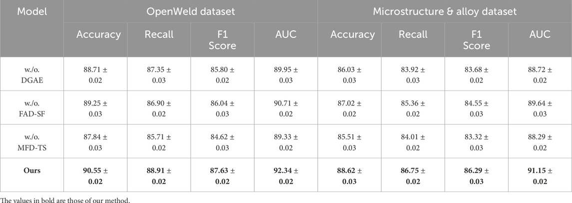 To validate the contribution of each core component in our model, we conducted comprehensive ablation studies across all four benchmark datasets. The results are summarized in Table 3, 4. We examine the impact of three key modules: the Confidence-Based Reliability Modeling, the Semantic Anchoring and Adaptive Calibration, and the Recursive Alignment and Confidence-Weighted Fusion. We report accuracy, recall, F1 score, and AUC to fully assess the behavior of each configuration. The full model consistently outperforms its ablated variants, clearly highlighting the necessity and synergy of all components. On the OpenWeld Dataset, the removal of component DGAE results in a drop in accuracy from 90.55% to 88.71%, and a similar degradation is observed across F1 score and AUC, indicating that the Confidence-Based Reliability Modeling is crucial for effectively leveraging both RGB and depth cues. Without component FAD-SF, we see a noticeable decrease in recall (from 88.91% to 86.90%) and F1 score (from 87.63% to 86.04%), which reflects the role of Semantic Anchoring and Adaptive Calibration in capturing hierarchical spatial information across indoor scenes. Ablating component MFD-TS leads to the most severe decline in performance on both OpenWeld and Microstructure & Alloy Datasets, suggesting that Recursive Alignment and Confidence-Weighted Fusion not only stabilizes training but also strengthens the semantic alignment between modality-specific representations. For the Microstructure & Alloy Dataset, our full model achieves an F1 score of 86.29%, whereas the version without component MFD-TS only reaches 83.32%. This performance gap justifies the inclusion of deep alignment strategies to enhance feature learning, particularly in complex semantic layouts with numerous overlapping entities.