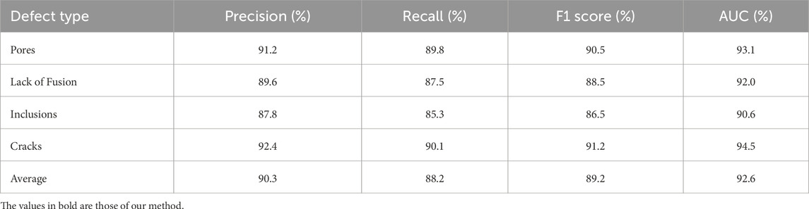 Table 5 presents the class-wise detection performance of the proposed DynaWave-Net model on four major defect types commonly found in dissimilar metal welds: pores, lack of fusion, inclusions, and cracks. The model achieves strong and balanced performance across all categories, with F1 scores ranging from 86.5% to 91.2% and an average of 89.2%. Among all defect types, cracks exhibit the highest F1 score (91.2%) and AUC (94.5%), which reflects the model’s strong ability to localize fine, linear structures—often characterized by high-frequency discontinuities well captured by the wavelet attention module. Pores are also detected with high precision (91.2%) and recall (89.8%), likely due to their well-defined boundaries and distinct circular geometry. In contrast, inclusions and lack of fusion show slightly lower performance (F1 scores of 86.5% and 88.5%, respectively). These defects tend to have more ambiguous visual signatures and irregular shapes, making them harder to distinguish from benign microstructural variations. However, the performance drop is marginal, indicating that the model still generalizes well to more complex defect types. The class-wise analysis demonstrates that the proposed method effectively adapts to diverse defect morphologies and maintains high reliability across different flaw categories. This robustness is particularly critical in industrial applications where multiple defect types may co-exist under varying inspection conditions.