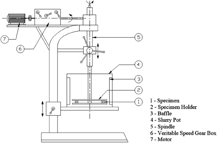 The erosion tests are being carried out using a conventional slurry pot setup, as shown in Figure 2, which has a circular cross section with a diameter of 320 mm and a height of 285 mm. This will allow for sufficient fluid volume to facilitate uniform erosion. The specimen holder consists of upper and lower circular plates with a diameter of 200 mm, designed to secure the CIs and specimens firmly in place. The specimen holder is being attached to the test rig spindle via a connecting rod, and the spindle is being powered by a motor operating at 625 rpm with a linear speed of 6.55 m/s.