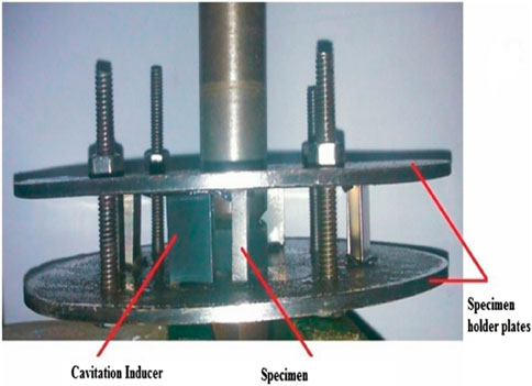 Figure 3. Illustrates the arrangement of the specimens and cavitation inducers clamped between two plates, facilitating the evaluation of test specimens under slurry erosion conditions.