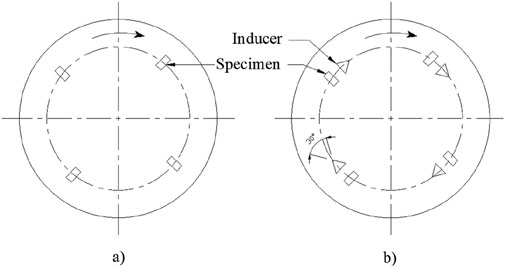 Figure 4a depicts the positioning of the specimen without cavitation inducers, meaning only the test specimen is present and undergoing slurry erosion testing. In contrast, Figure 4b displays the specimen setup with cavitation inducers. The triangular cavitation inducers, designed with an apex angle of 30°, are employed to generate localized cavitation effects. Here, the specimens undergo testing for the combined effects of slurry and cavitation erosion. In both configurations, specimens are continuously mounted on a rotating disk to replicate erosive wear conditions. As a result, the developed test ring serves to examine specimens under both slurry erosions alone and the combined impact of slurry and cavitation erosion. Specimens weighed with 0.1 mg precision before and after each test interval (5 h). Cleaned with ethanol and dried before weighing. Three replicate samples were tested for each condition to ensure reproducibility.