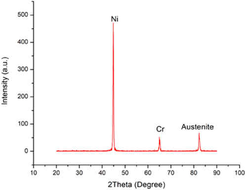 Chromium, as a solid-solution element in Ni-based alloys, does not generally appear as a distinct separate phase; instead, it alters the lattice parameters of the Ni solid solution. This explains the absence of a separate Cr peak. The high-angle austenite peak at ∼82° corresponds to the fcc Ni–Cr solid solution and retained austenite from the stainless steel substrate.